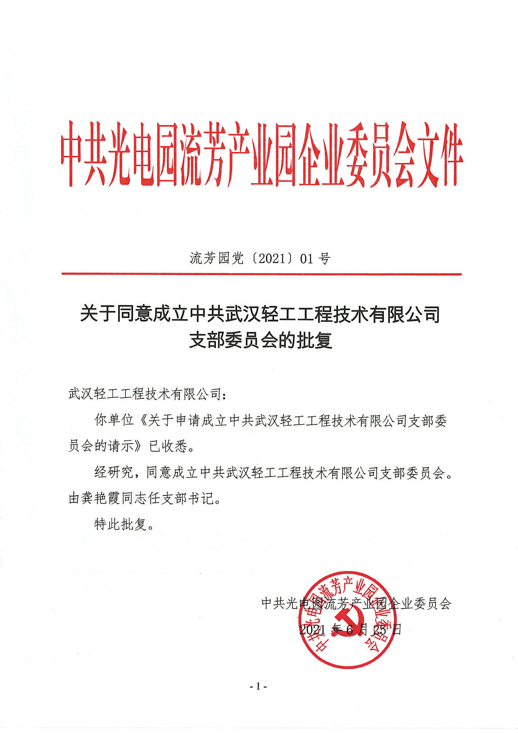 中共光電園流芳產(chǎn)業(yè)園企業(yè)委員會江峰書記宣布:經(jīng)多方面核實,武漢輕工工程技術(shù)有限公司員工整體思想認(rèn)識較高,業(yè)務(wù)能力較強,生活上相互關(guān)心,同事之間相處融洽,充分發(fā)揚了黨組織戰(zhàn)斗堡壘與黨員在群眾中的模范帶頭作用,同時規(guī)范黨員組織生活,加強對黨員同志的組織管理,從而增強了公司員工的凝聚力;按照黨章及有關(guān)規(guī)定,結(jié)合公司實際情況,同意成立“中共武漢輕工工程技術(shù)有限公司支部委員會”。